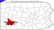 Westmoreland County is a county located in the U.S. state of Pennsylvania. It was founded on February 26, 1773, and was the first county in the colony of Pennsylvania west of the Allegheny Mountains. Westmoreland County originally included the present-day counties of Fayette, Washington, Greene, and parts of Beaver, Allegheny, Indiana, and Armstrong counties. At the 2000 census, the population was 369,993. The county seat is Greensburg[1]. It is part of the Pittsburgh Metro Area, while eastern Westmoreland County borders the Johnstown Metro Area. A major coal strike occurred in the county in the winter of 1910-1911.